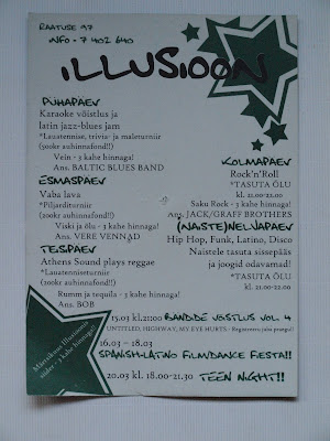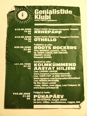 Seega, veel kord, järgnev postitus ei ole lõplik. Lisada on veel sama suur ports flaiereid, aga mis palju tähtsam, tegemata on suur osa mõttetööst. Kui lugejal-vaatajal vähegi viitsimist on, oleksin väga tänulik, kui postitaksite siia ka oma kommentaarid (olgu siis mõne üksiku flaieri kohta, mõne pidudesarja, klubi vms kohta). Kui tundsite ära mõne flaieri autori, võiksite sellestki teada anda.