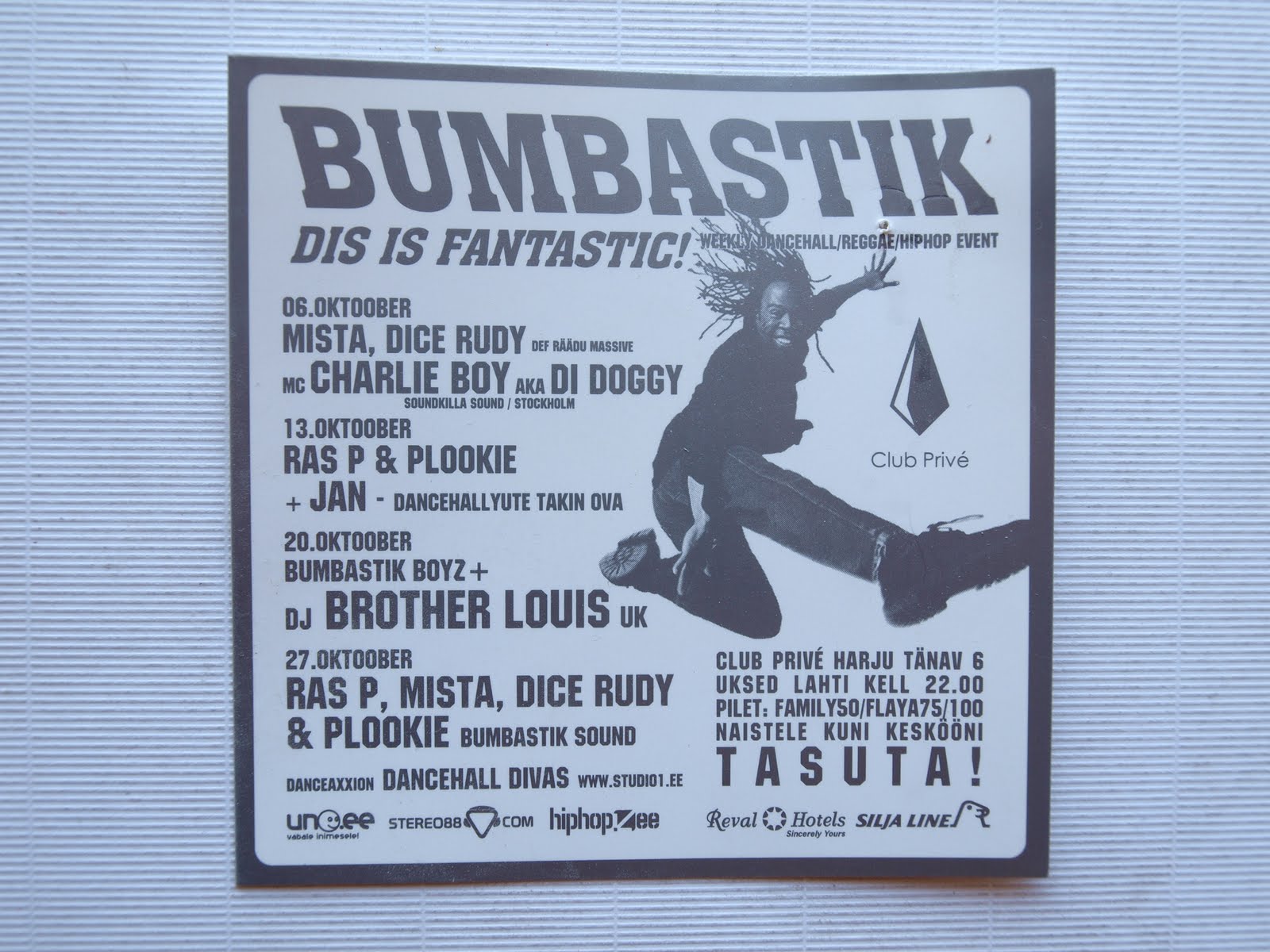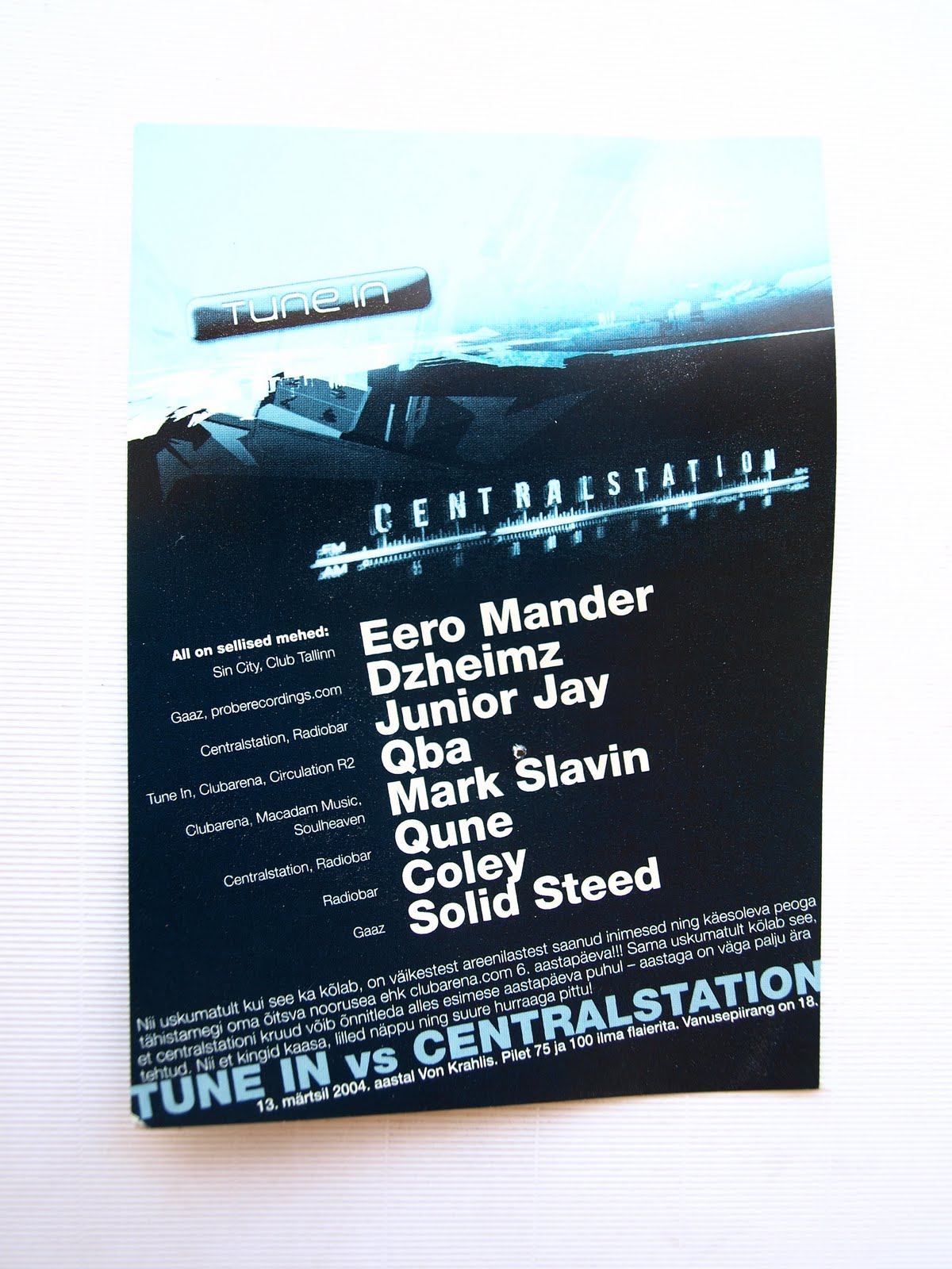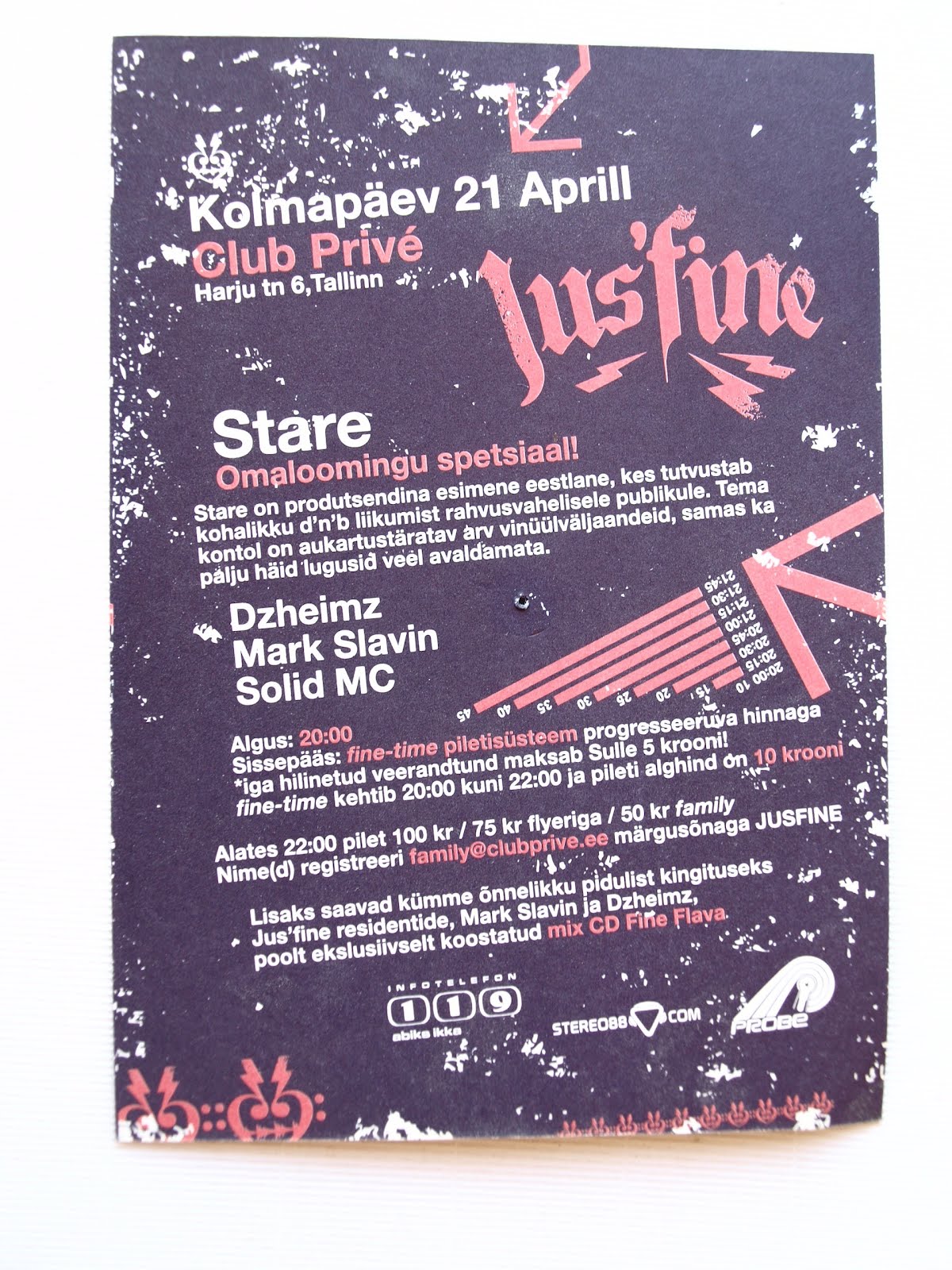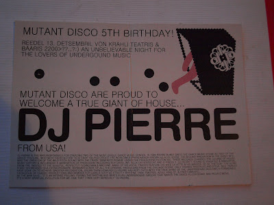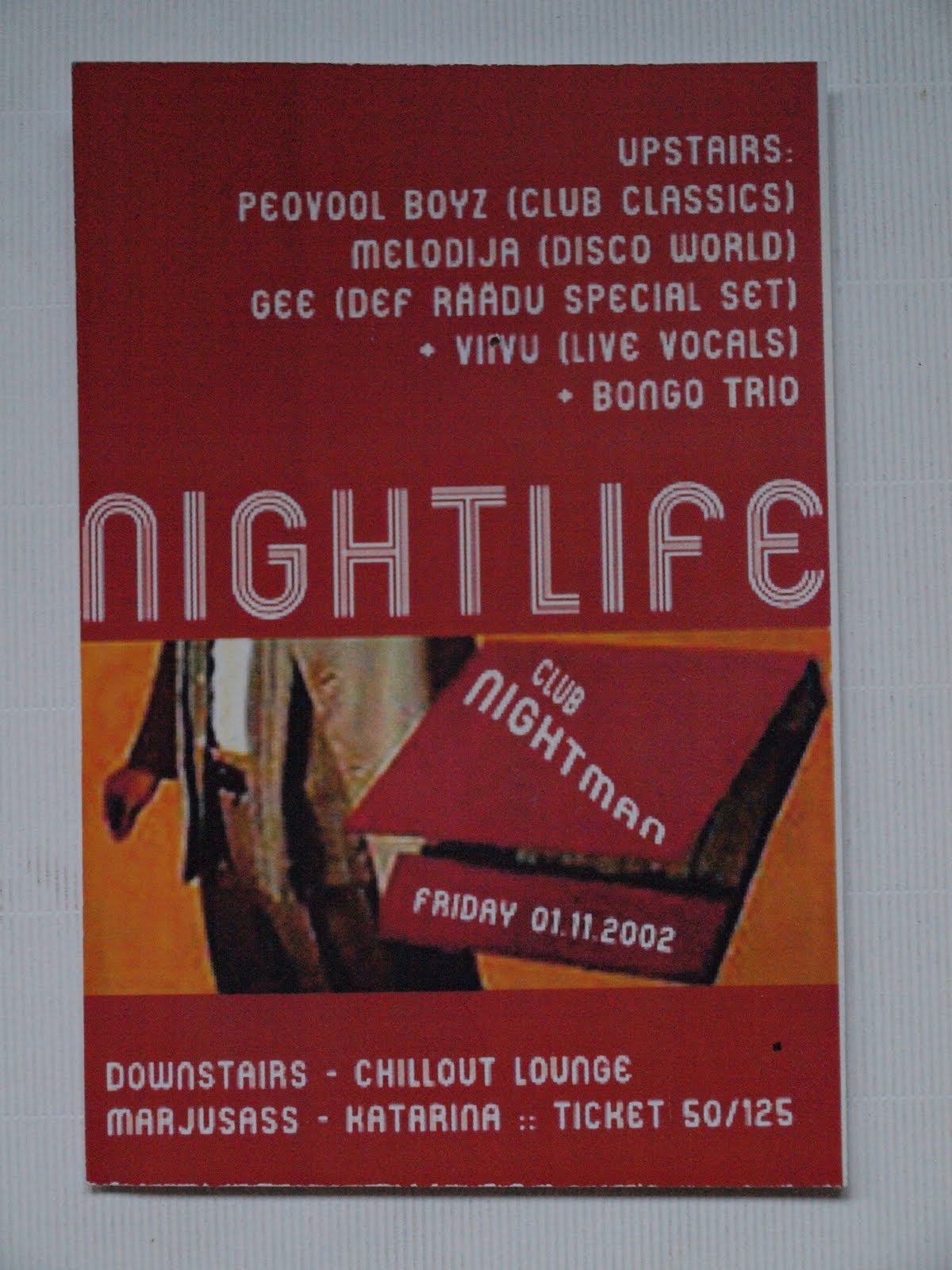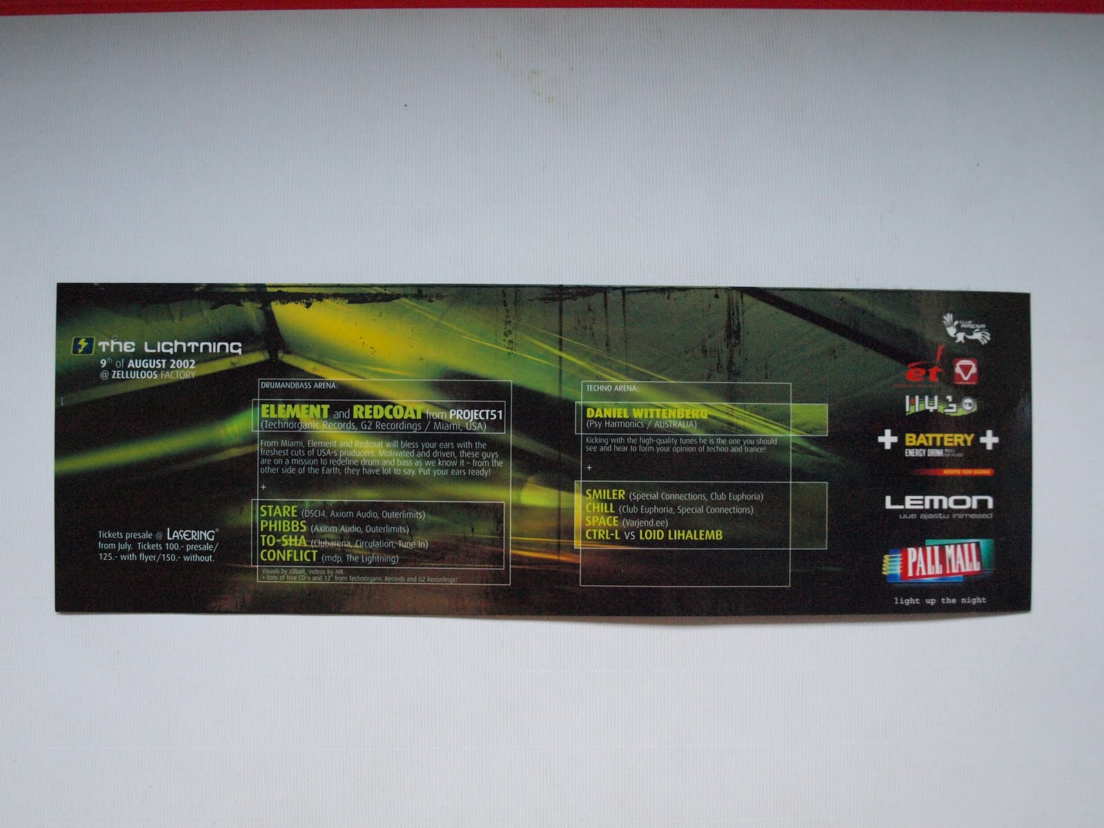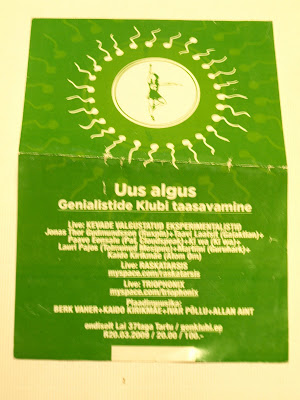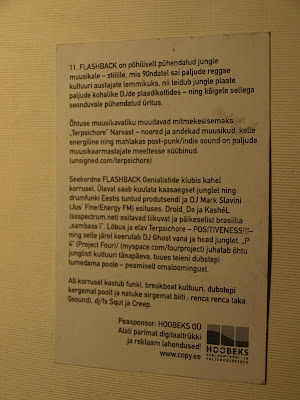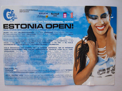 PPS. Kõik järgnevad flaierid on (väga erinevate valgustingimuste juures) üsna lohakalt üles pildistatud.Võinuks ju ka skanneerida (tohutu ajakulu), kuid pidasin flaierite graafilise disaini kõrval oluliseks ka nende paberilise väljanägemise rõhutamist. Kui hästi otsida, siis leiaks tõenäoliselt kõikidest järgnevatest flaieritest ka netiversiooni (nt on seni veel üleval eesti klubikultuuri hindamatu andmebaas Mutant Disco message board: http://www.mutantdisco.com/messageboard-main.phtml), kuid see poleks enam saa. Mingil hetkel lakkasid flaier flaier olemast ja plakat plakat olemast, võrgus sai mõlemast üks ja sama tegelane ning välja trükkides ei olnud neid enam mõttekas lahutada.