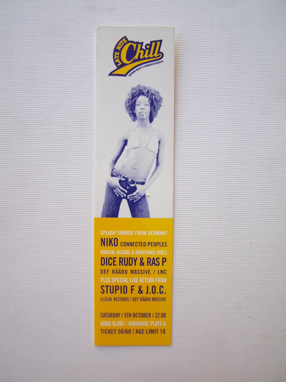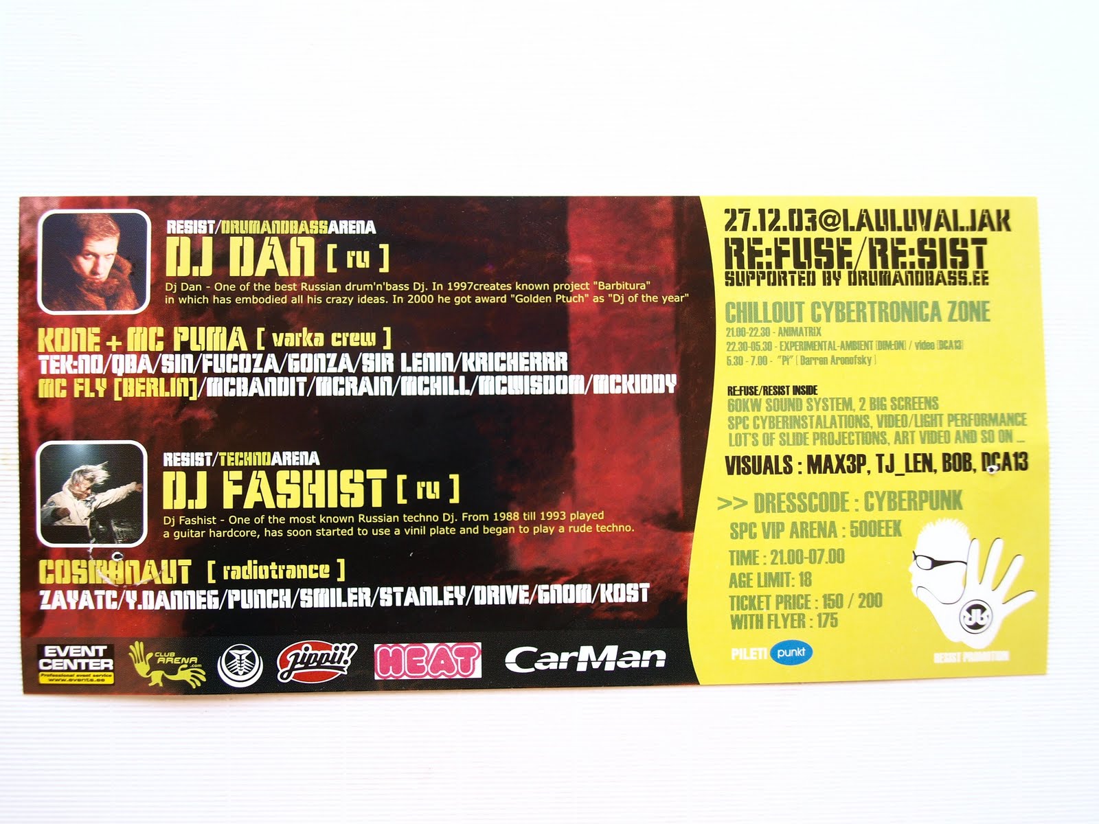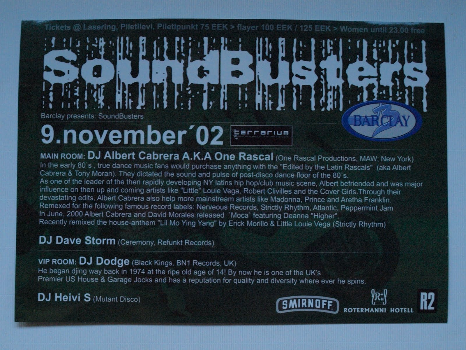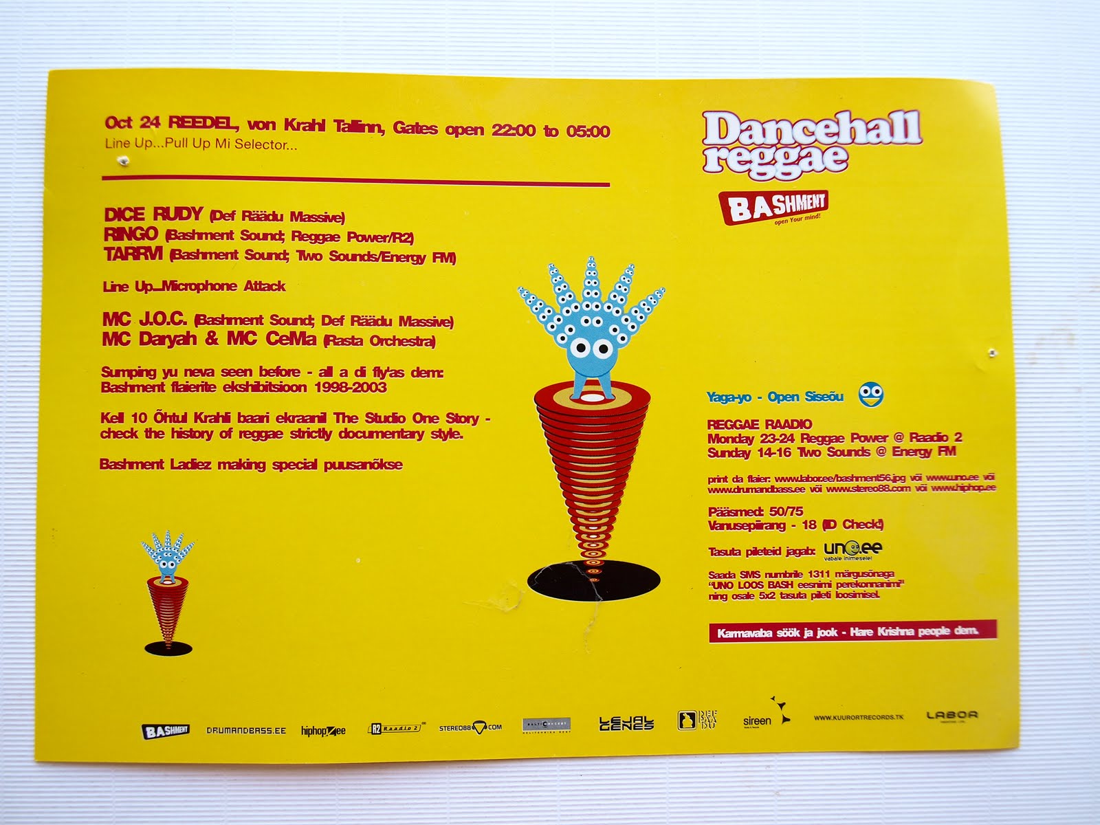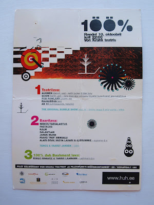 PPS. Kõik järgnevad flaierid on (väga erinevate valgustingimuste juures) üsna lohakalt üles pildistatud.Võinuks ju ka skanneerida (tohutu ajakulu), kuid pidasin flaierite graafilise disaini kõrval oluliseks ka nende paberilise väljanägemise rõhutamist. Kui hästi otsida, siis leiaks tõenäoliselt kõikidest järgnevatest flaieritest ka netiversiooni (nt on seni veel üleval eesti klubikultuuri hindamatu andmebaas Mutant Disco message board: http://www.mutantdisco.com/messageboard-main.phtml), kuid see poleks enam saa. Mingil hetkel lakkasid flaier flaier olemast ja plakat plakat olemast, võrgus sai mõlemast üks ja sama tegelane ning välja trükkides ei olnud neid enam mõttekas lahutada.