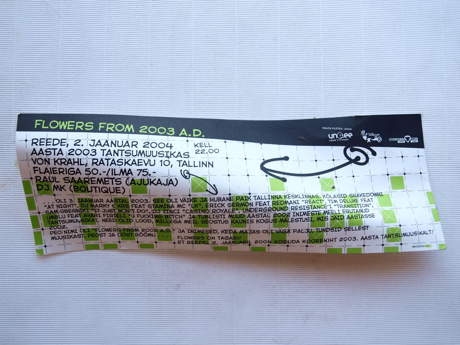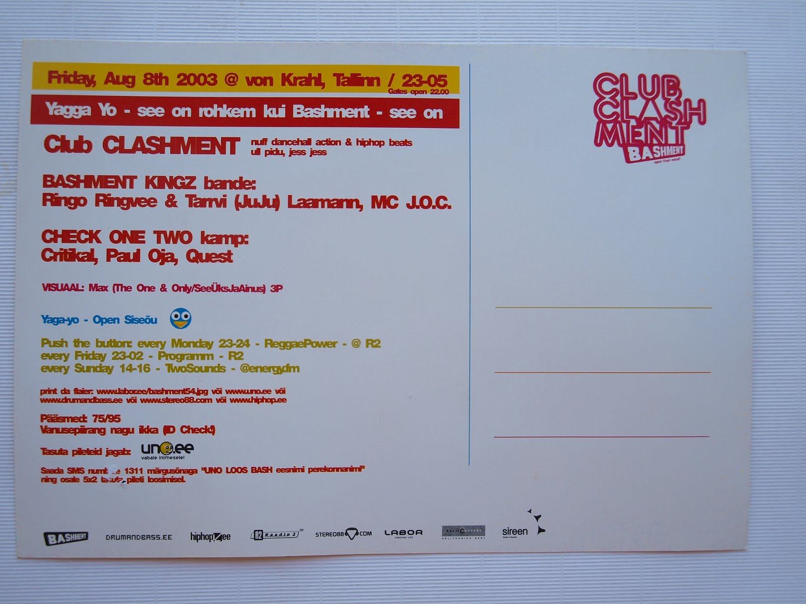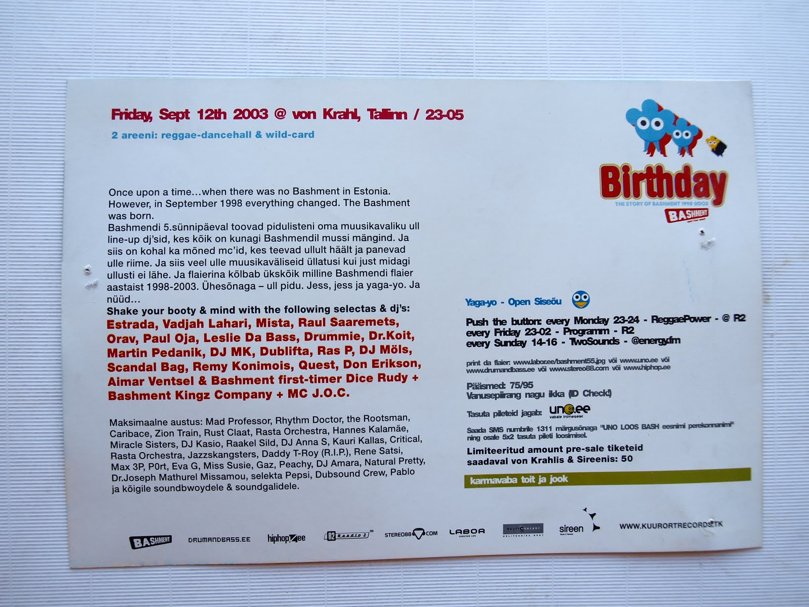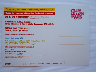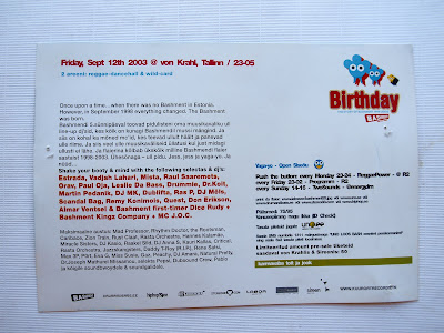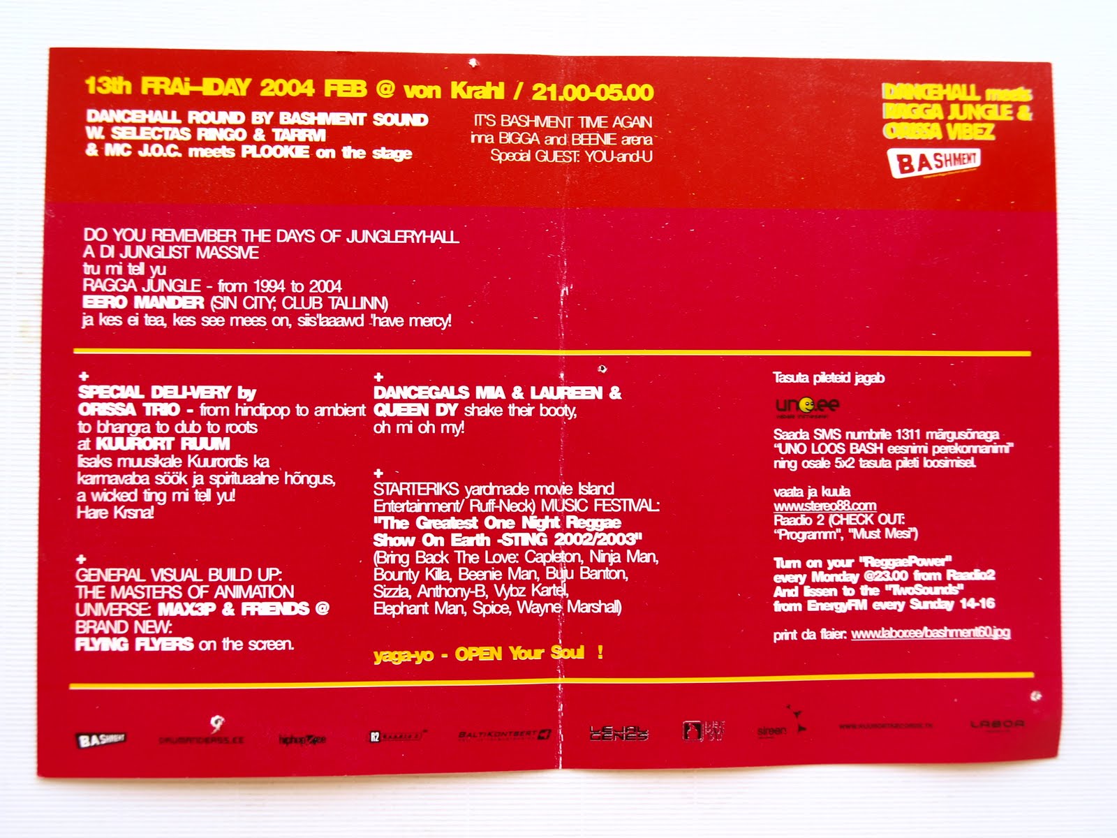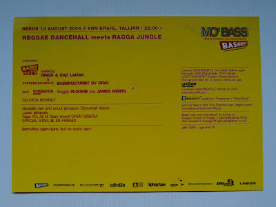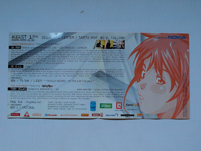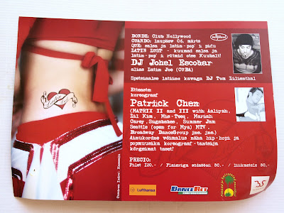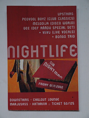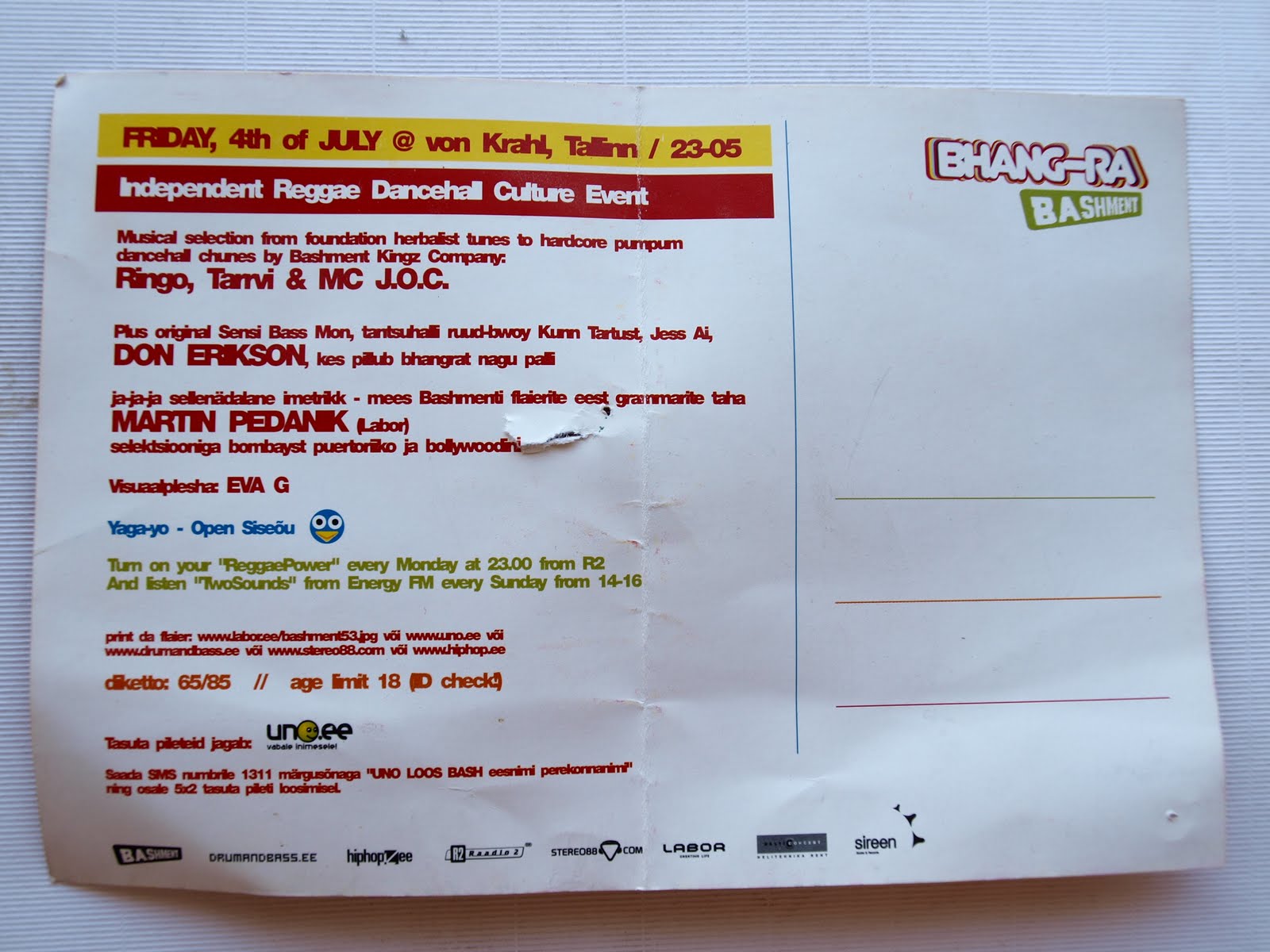 PPS. Kõik järgnevad flaierid on (väga erinevate valgustingimuste juures) üsna lohakalt üles pildistatud.Võinuks ju ka skanneerida (tohutu ajakulu), kuid pidasin flaierite graafilise disaini kõrval oluliseks ka nende paberilise väljanägemise rõhutamist. Kui hästi otsida, siis leiaks tõenäoliselt kõikidest järgnevatest flaieritest ka netiversiooni (nt on seni veel üleval eesti klubikultuuri hindamatu andmebaas Mutant Disco message board: http://www.mutantdisco.com/messageboard-main.phtml), kuid see poleks enam saa. Mingil hetkel lakkasid flaier flaier olemast ja plakat plakat olemast, võrgus sai mõlemast üks ja sama tegelane ning välja trükkides ei olnud neid enam mõttekas lahutada.