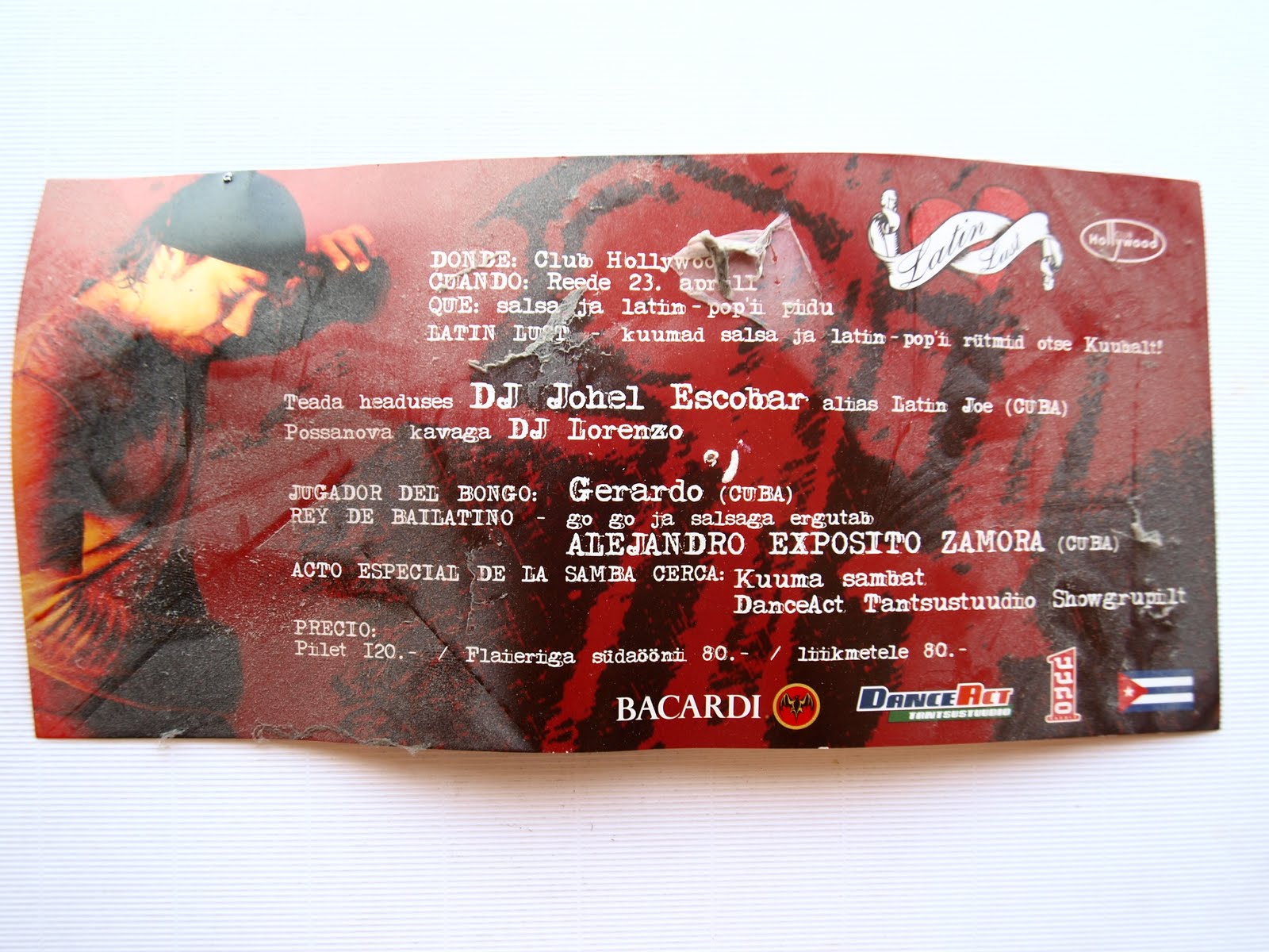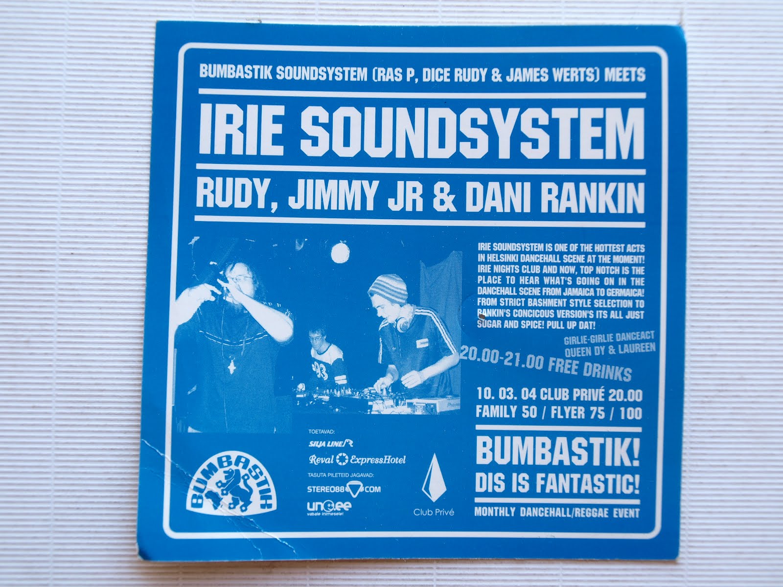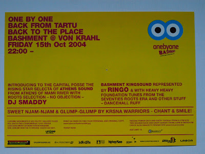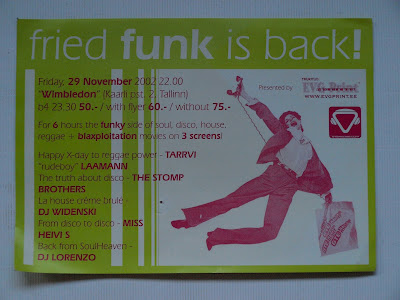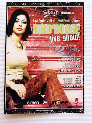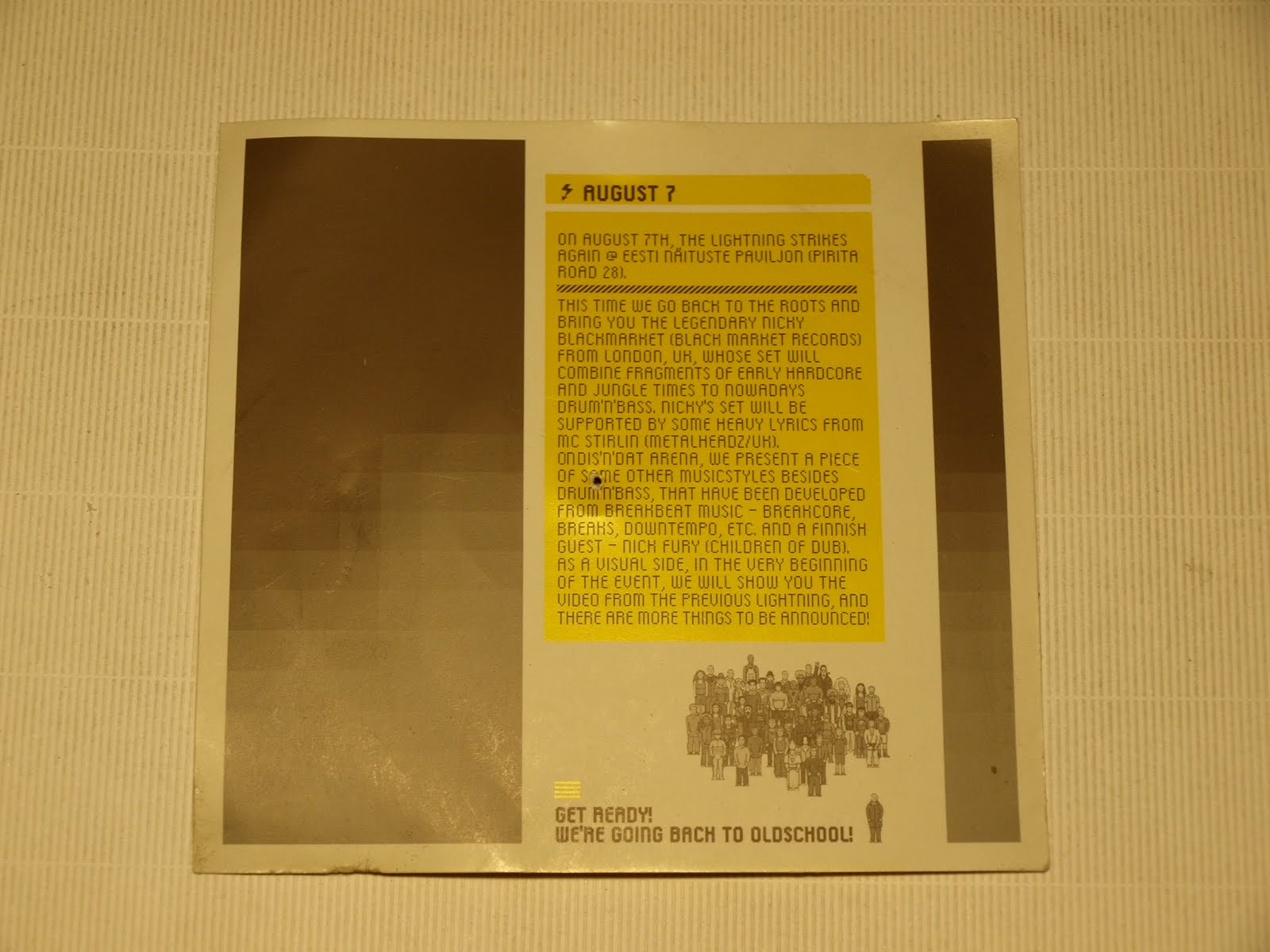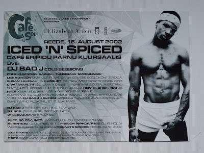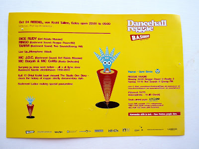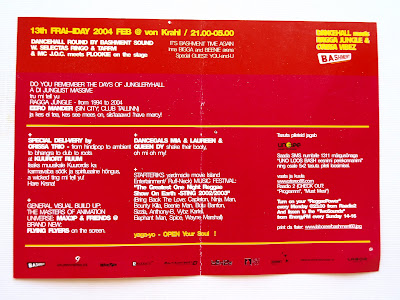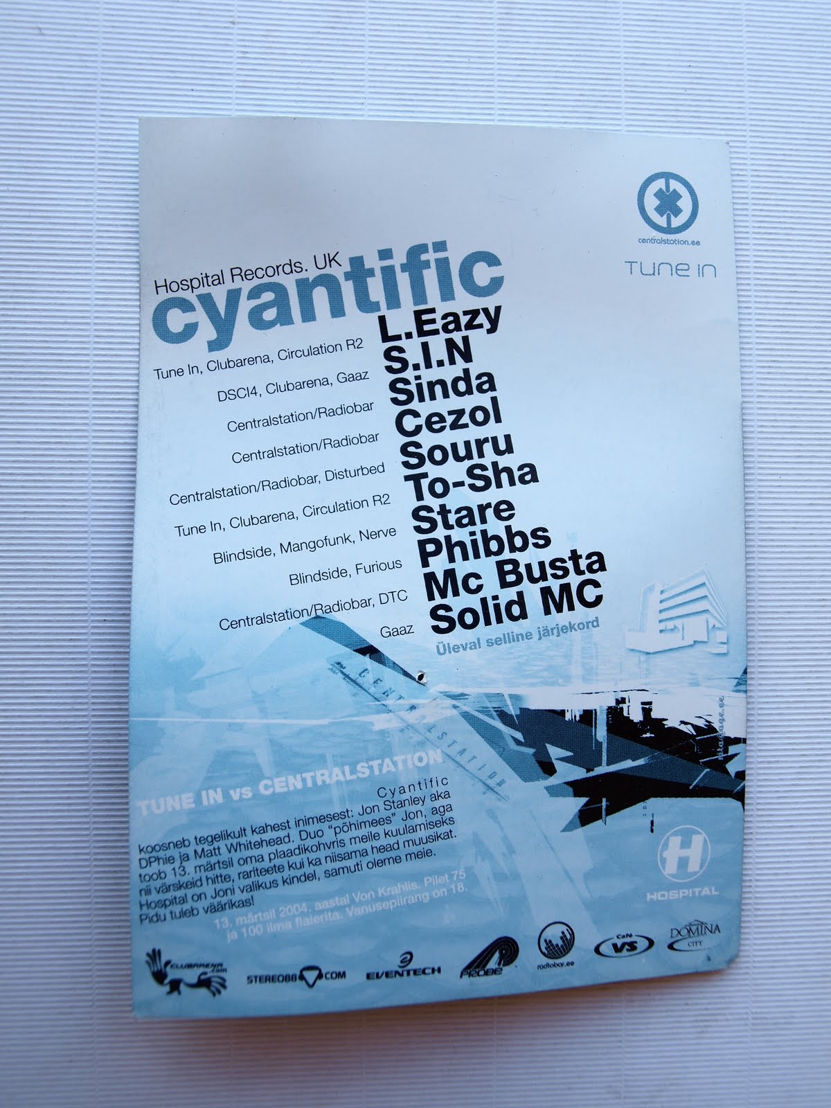 PPS. Kõik järgnevad flaierid on (väga erinevate valgustingimuste juures) üsna lohakalt üles pildistatud.Võinuks ju ka skanneerida (tohutu ajakulu), kuid pidasin flaierite graafilise disaini kõrval oluliseks ka nende paberilise väljanägemise rõhutamist. Kui hästi otsida, siis leiaks tõenäoliselt kõikidest järgnevatest flaieritest ka netiversiooni (nt on seni veel üleval eesti klubikultuuri hindamatu andmebaas Mutant Disco message board: http://www.mutantdisco.com/messageboard-main.phtml), kuid see poleks enam saa. Mingil hetkel lakkasid flaier flaier olemast ja plakat plakat olemast, võrgus sai mõlemast üks ja sama tegelane ning välja trükkides ei olnud neid enam mõttekas lahutada.