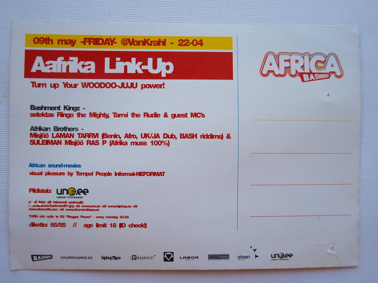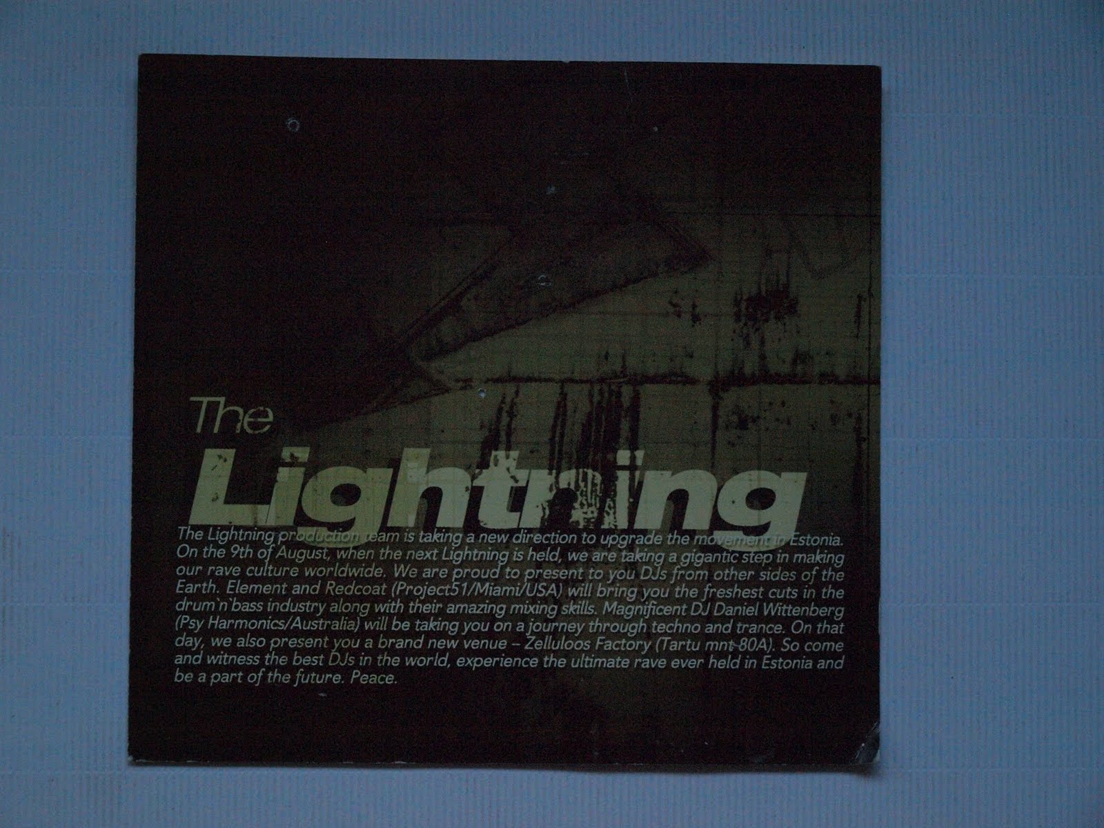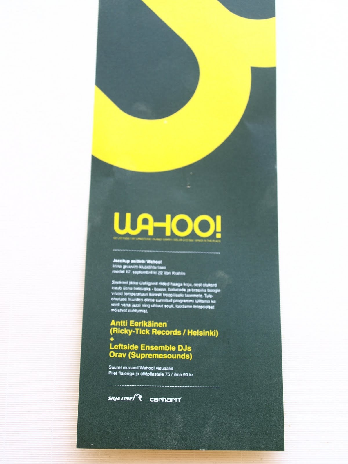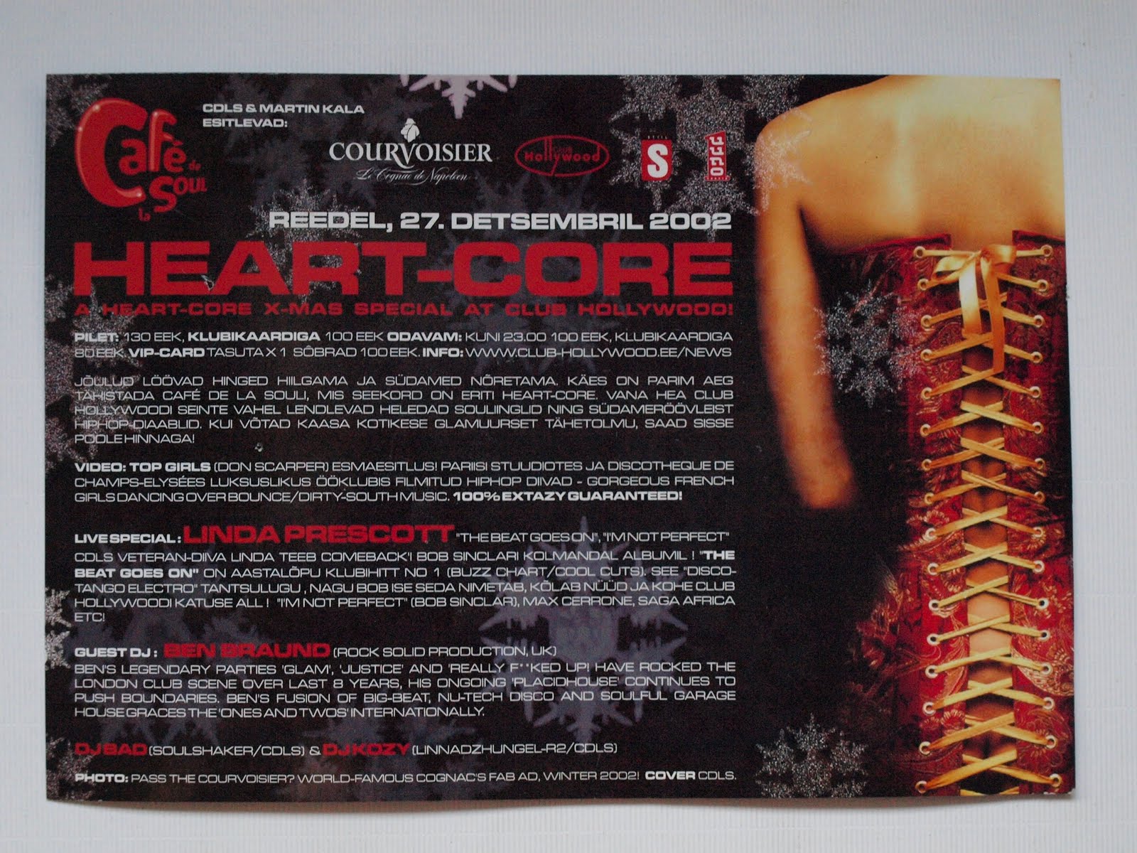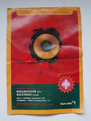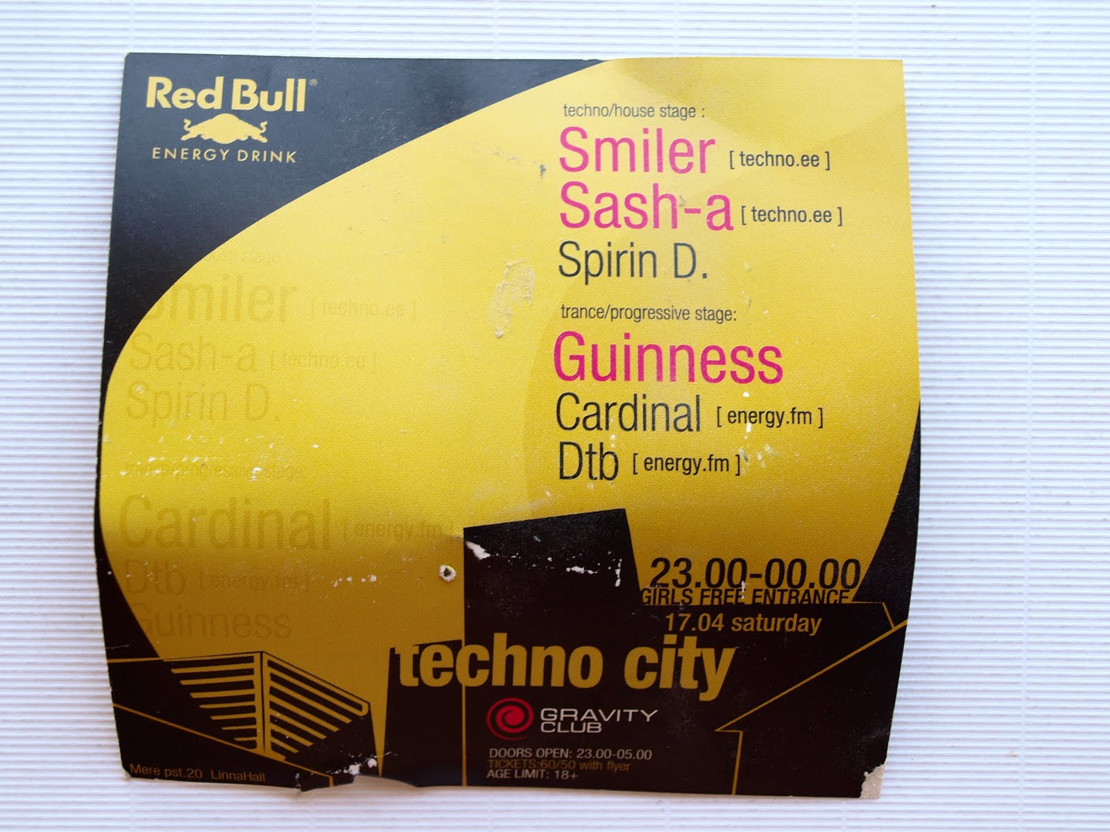 PPS. Kõik järgnevad flaierid on (väga erinevate valgustingimuste juures) üsna lohakalt üles pildistatud.Võinuks ju ka skanneerida (tohutu ajakulu), kuid pidasin flaierite graafilise disaini kõrval oluliseks ka nende paberilise väljanägemise rõhutamist. Kui hästi otsida, siis leiaks tõenäoliselt kõikidest järgnevatest flaieritest ka netiversiooni (nt on seni veel üleval eesti klubikultuuri hindamatu andmebaas Mutant Disco message board: http://www.mutantdisco.com/messageboard-main.phtml), kuid see poleks enam saa. Mingil hetkel lakkasid flaier flaier olemast ja plakat plakat olemast, võrgus sai mõlemast üks ja sama tegelane ning välja trükkides ei olnud neid enam mõttekas lahutada.