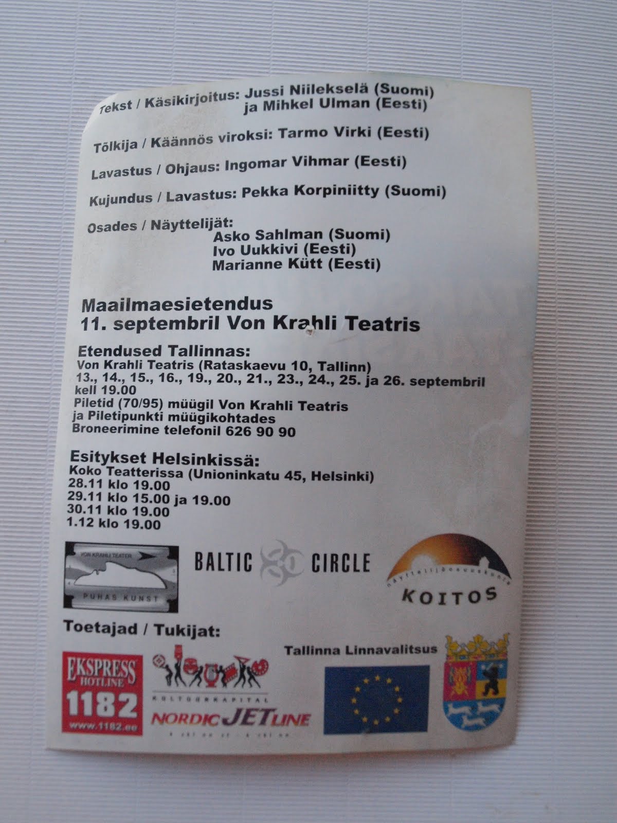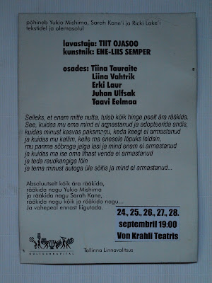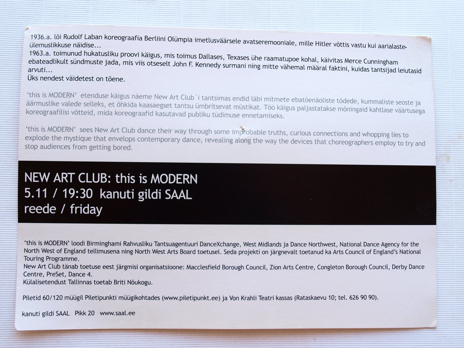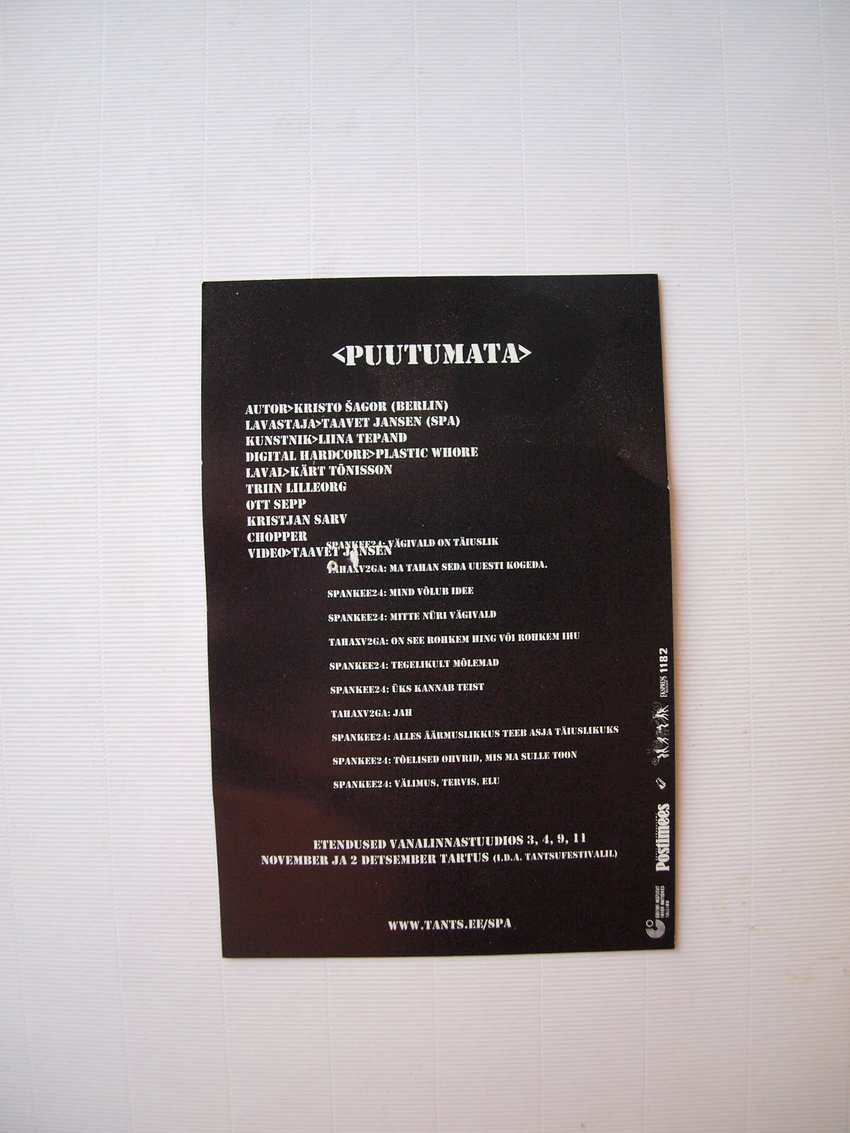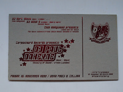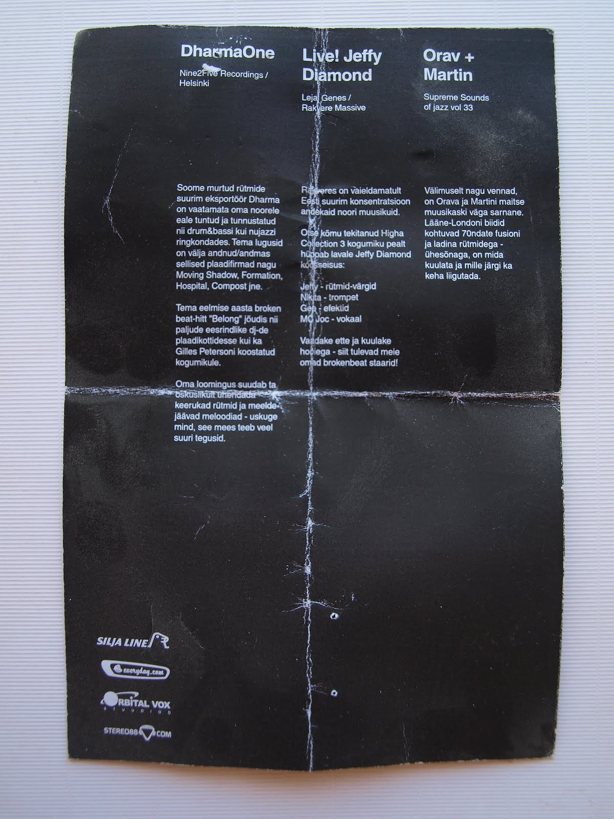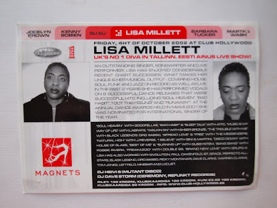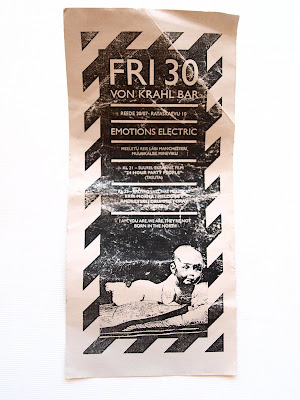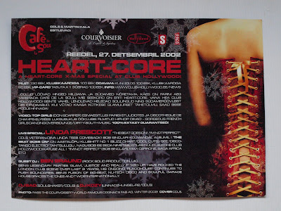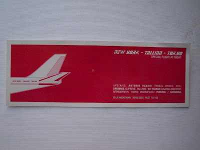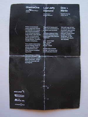 PPS. Kõik järgnevad flaierid on (väga erinevate valgustingimuste juures) üsna lohakalt üles pildistatud.Võinuks ju ka skanneerida (tohutu ajakulu), kuid pidasin flaierite graafilise disaini kõrval oluliseks ka nende paberilise väljanägemise rõhutamist. Kui hästi otsida, siis leiaks tõenäoliselt kõikidest järgnevatest flaieritest ka netiversiooni (nt on seni veel üleval eesti klubikultuuri hindamatu andmebaas Mutant Disco message board: http://www.mutantdisco.com/messageboard-main.phtml), kuid see poleks enam saa. Mingil hetkel lakkasid flaier flaier olemast ja plakat plakat olemast, võrgus sai mõlemast üks ja sama tegelane ning välja trükkides ei olnud neid enam mõttekas lahutada.