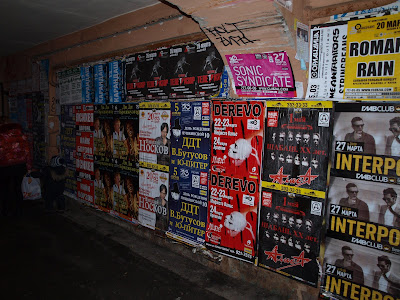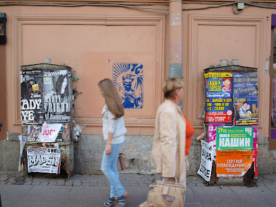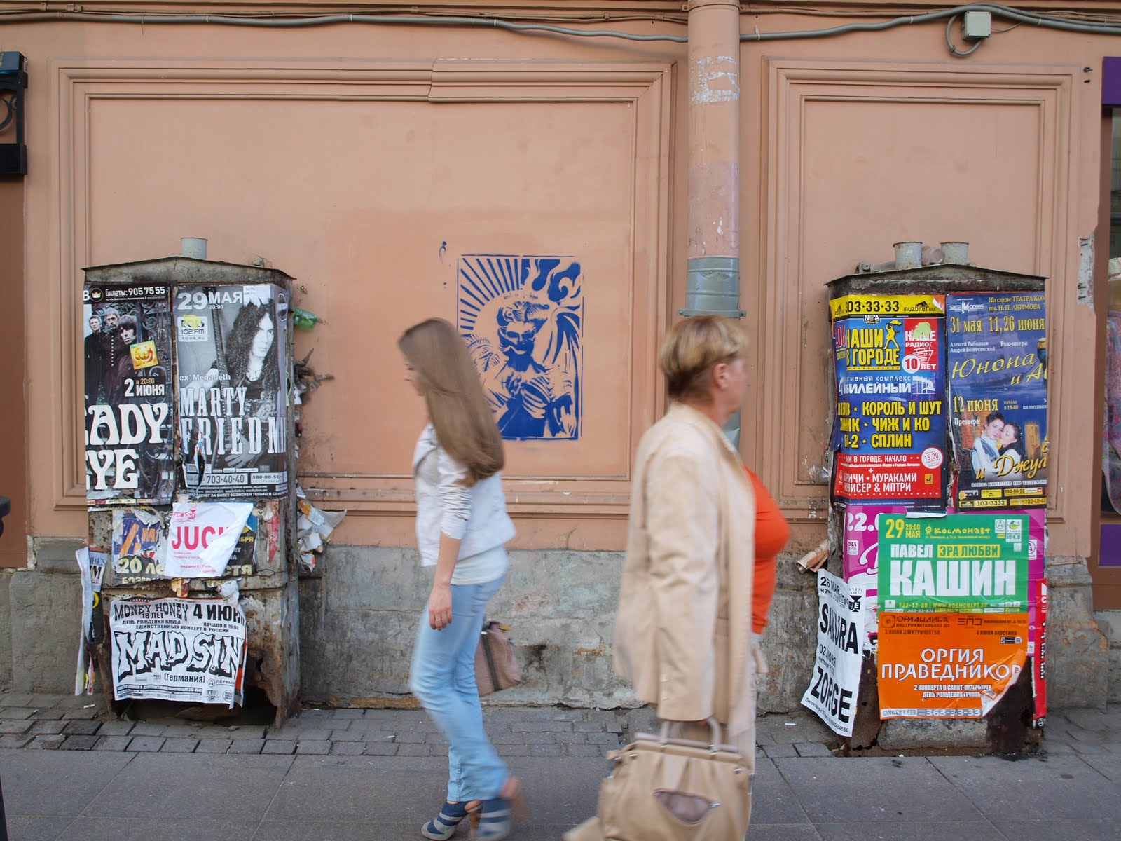 Mainin neid kommertsiaalseid plakatiseinu, kuna oma olemuselt toimivad need siiski algupäraste (demokraatlike!) plankudena, kuhu igamees võib piisava tahtmise ja julguse korral sõna levitama minna ja ma leian, et see on suurepärane. Lisaks nendele raamitud plankudele on paraku ka Peterburi täispikitud JC Decaux püstitatud bussipeatuseid ja reklaamtulpasid, kus plakatid on barbaarsel moel klaasi taha peidetud, nii et ükski käsi neid korralikult üle kleepida ei suuda.