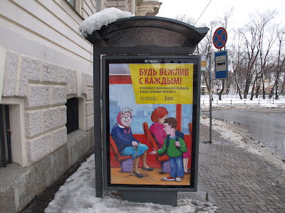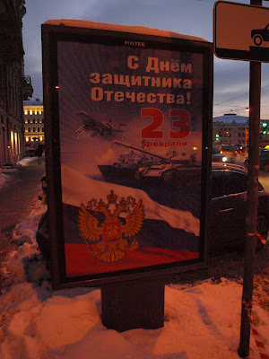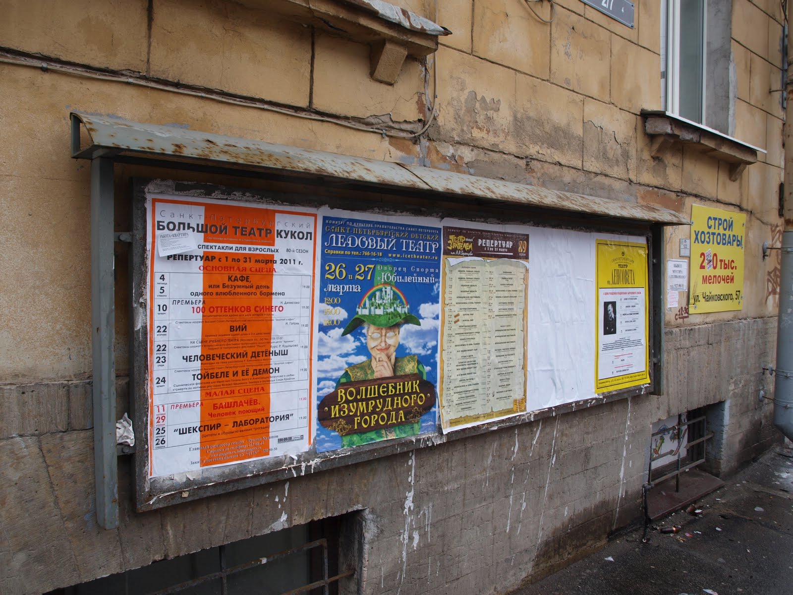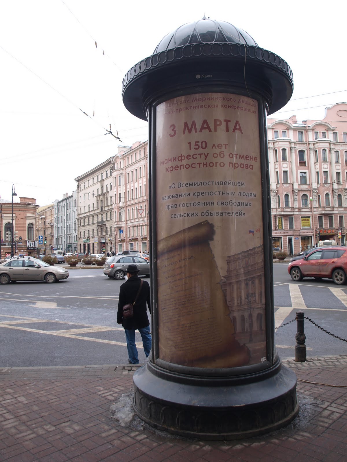 Peterburis ja küllap mujalgi Venemaal on säilinud üks minu arust positiivne rudiment sotsialistlikust riigist. Nimelt riputab linnavalitsus tänaseni linna afišše ja kuulutusi, kus tuletatakse peterburlastele meelde, et lähenemas on isadepäev, emadepäev, vastlad või mõni muu püha ja muidu tähtis päev. Eriliselt hoolivalt mõjuvad ümmargustele pöörlevatele tulpadele paigaldatavad plakatid, kus linnavalitsus annab fotopäeviku näol teada, mida huvitavat viimase kuu jooksul Peterburis toimus. Noh, eks see õigupoolest selline kahe otsaga asi on, et väga palju selline info edastamine ju Tallinna TV vms ekraanist Vabaduse väljakul ei erine.. kuid samas - millal poleks linnavalitsemine olnud poliitika oma parimate vahenditega?