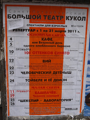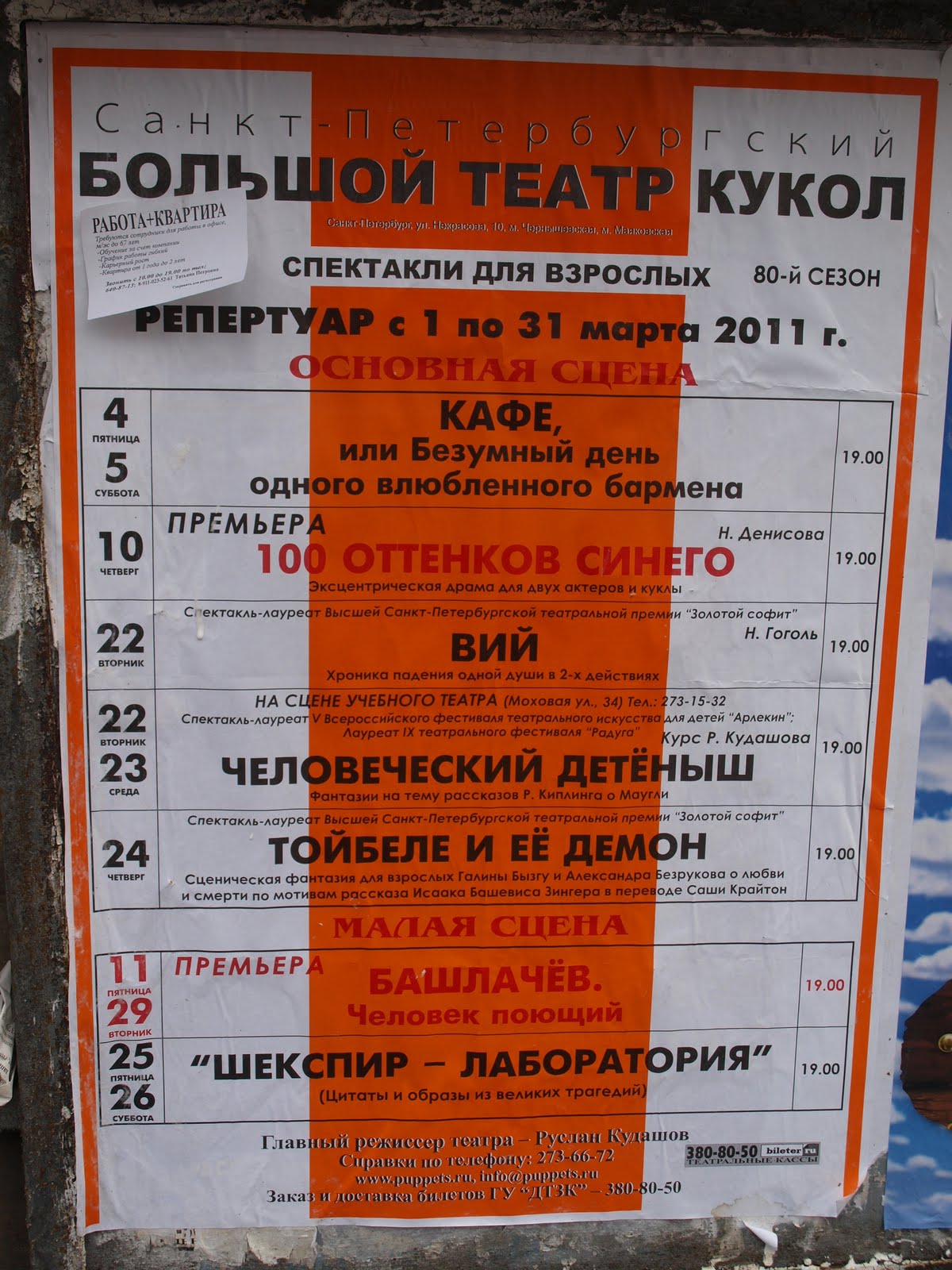Peterburi muusika- ja balletiteatrid (aga ka mõned sõnateatrid) piirduvad reklaami puhul tihtipeale vaid afiššidega, millele on kantud käesoleva kuu repertuaar. Sellised tekstiribad mõjuvad muidu moondunud pildimüras tervendava pausina, kuigi on kahju, et nii palju lavastusi läheb plakatite näol kaotsi.