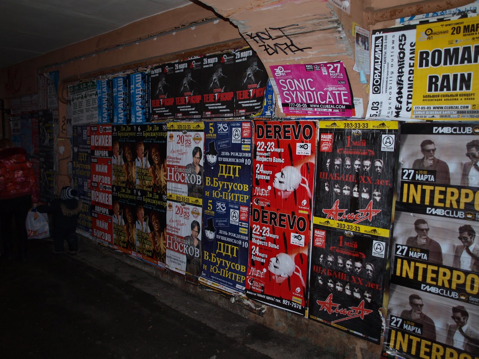 Kuhu ja kuidas riputatakse Peterburis plakatid? Laias plaanis kõikjale ja igal võimalikul moel, kuid eksisteerib ka teatav hierarhia. Näiteks on tuhandetele majadele kinnitatud n-ö reklaamiraamid, mis on mõeldud kultuuriüritustest teada andmiseks. Küllap on nendes raamides (iseenesest on need linna hästi sobivad stiilipuhtad disainiobjektid) reklaamimine kallis lõbu, sest üldjuhul vahivad nendelt piltidelt välja ühe puuga löödud estraaditähed. Lisaks nendele küllaltki uhketele raamidele leidub linnas ka palju närusemaid plakatitahvleid, mis on kõvasti roostetanud ja muljuda saanud. Need plekist tahvlid meenutavad postide ümber riputatud prügikaste, mis miljonite konide poolt tuhmiks võõbatud on. Paistab, et needki tahvlid on kõrgelt maksustatud, sest enamasti reklaamitakse nendel lääne muusika supertähti.