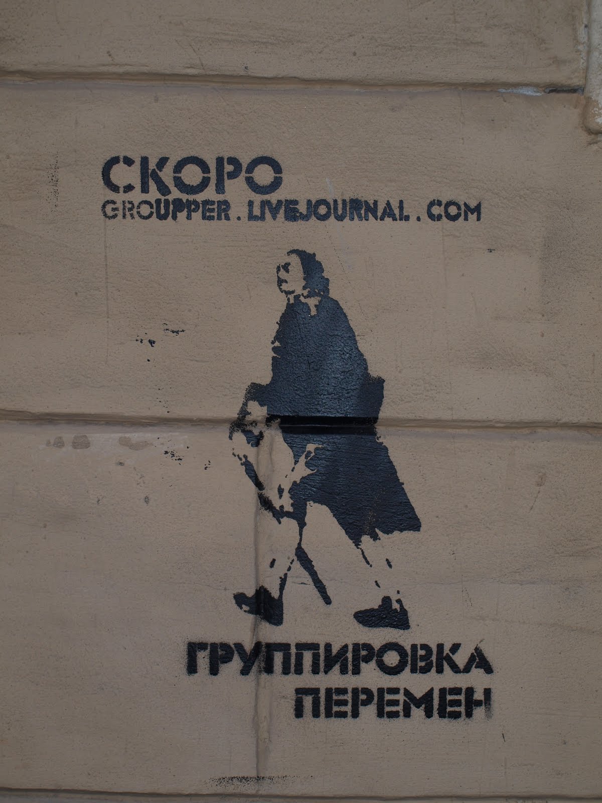Vot, kõndisin siis kõrvaklapid peas Fontanka poole. Ühes käes kannan ikka fotokat, et juhul kui midagi silma jääb, siis kohe klõpsan. Jelissejevi kaubamaja juures tajusin, et minuga samas suunas liigub räuskav mees, kes inimesi tülitab. Ei lasknud ennast häirida ning jalutasin kiires tempos edasi. Olin mehe juba unustanud, kui jõudsin tolle grafitini, millest ülal pilt oli. Kuna oli pime aeg, läks objektiivi sättimisega kauem aega, kuni ühtäkki see vastik sell, keda enne olin tüli norimas näinud, mind ründas. Haaras õlast, tõukles ja mörises mulle näkku, et siin ei tohi pildistada, kelleks ma ennast pean. Kõige hirmsam tema käitumise juures oli see, et ta apelleeris ülejäänud linnarahvale, et minu puhul on tegemist ohtliku inimesega, kelle vastu peaksid kõik sallimatust välja näitama. Fanaatiline ja vist stalinistlik suhtumine, et kui sa ei ole meiega, oled sa meie vastu ja keegi ei tohi olla sinu poolt. Jа grafiti pildistamine on tingimata spioneeriv + intellektuaalne tegevus, mida tuleb koheselt takistada. Õnneks olid selleks päevaks ajad muutunud - ei rutanud keegi purjus meest toetama, nagu ei teinud keegi ka minu täbarat olukorda märkama. Inimesed proovisid lihtsalt oma elu elada. Tajusin heroilise šansi lähedust, tõukasin mehe pikali ja kõndisin ruttu minema, ilma et oleksin kordagi tagasi vaadanud.