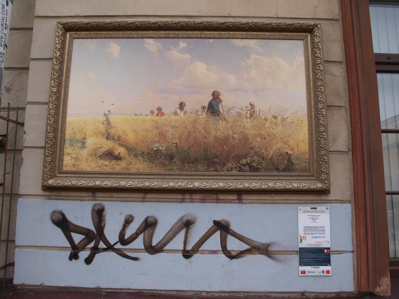 Eelnevad kolm fotot kõnelevad huvitavast paradoksist. Paar aastat tagasi tuli Vene muuseum välja minu arust väga hea mõtte ja teostusega - Gribojedovi kanali ääres asetsevatele majadele "riputati" elusuurused koopiad muuseumi meistriteostest. Maali kõrvale pandi ka tutvustav tekst telefoninumbriga, millele helistades võib kuulata lühiloengut antud maali kohta. Õnnetuseks ei pidanud õue toodud maalid eriti kaua vastu - need kas pätsati või lõhuti kohapeal. Vandalismi järel näeb olukord Vene muuseumi ja Nevski prospekti vahel välja eriti markantne, just nagu oleksid antiinstitutsionaalsed grafiti-inimesed pidanud maha triumfaalse lahingu nende jaoks läppunud Vene Muuseumi vastu.